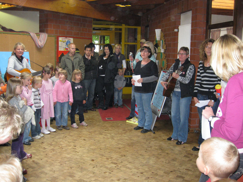 Musik wird bei uns großgeschrieben. Wir singen Kindergartenlieder, Lieder zur Jahreszeit oder zum Festanlass. Dafür treffen uns auch mit allen Kindern und Erzieherinnen in unserer Halle und singen gemeinsam mit Gitarrenbegleitung und anderen Instrumenten. Wir möchten, dass die Kinder viele traditionelle und neue Lieder kennen lernen. Neben der sprachfördernden Wirkung stehen die Freude am Gesang sowie die Stärkung der Gemeinsamkeit im Vordergrund. Nicht selten sind die Kinder stolz und erfreut, ihre musikalischen Fertigkeiten bei Feiern, Festen und Veranstaltungen unter Beweis zu stellen.