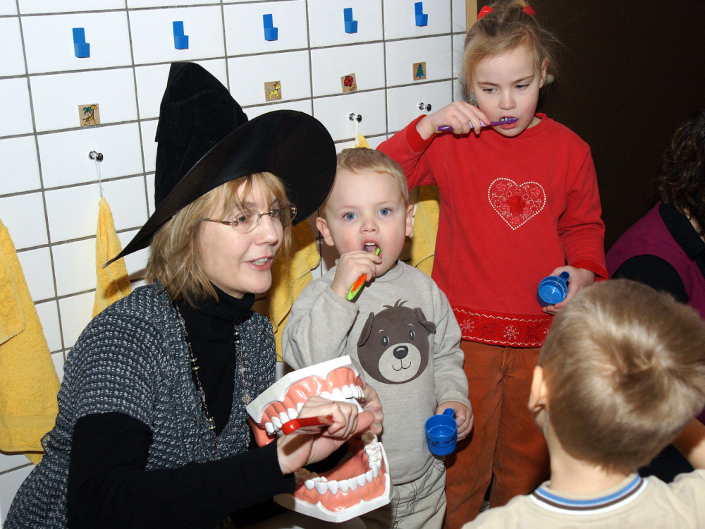 Neben der gesunden Ernährung achten die Erzieherinnen auch darauf, dass sich die Kinder nach jeder Mahlzeit die Zähne putzen. Die Zahnärztin Frau Dr. Pfaff aus Unna-Massen besucht uns mehrmals jährlich und berät Kinder, Eltern und Mitarbeiter in Bezug auf Zahnpflege. Auch der zahnärztliche Dienst vom Gesundheitsamt bringt den Kindern in regelmäßigen Abständen das Thema Zahnarzt und Zahnpflege näher.